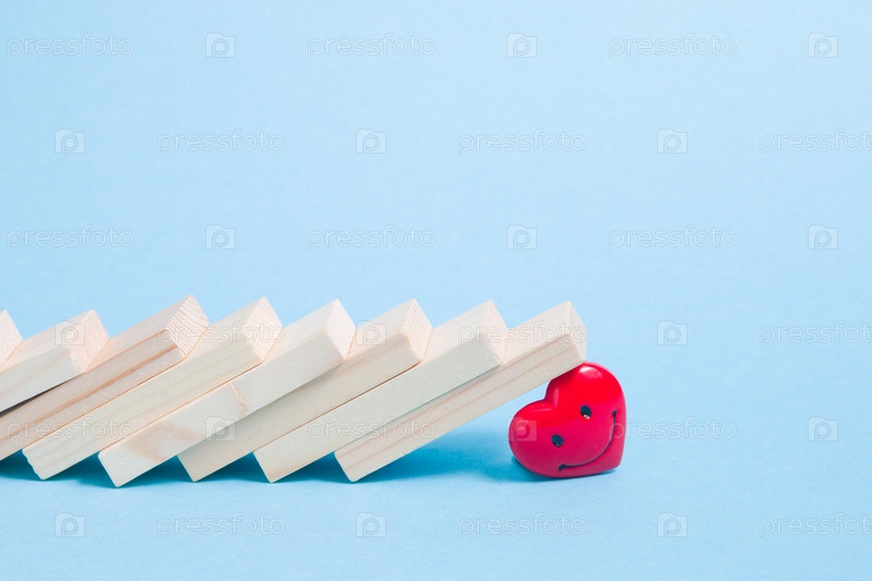 Домино упало на красное сердце, светло-голубой фон, пространство для копирования, концепция разбитого сердца, угроза здоровью, концепция принца домино