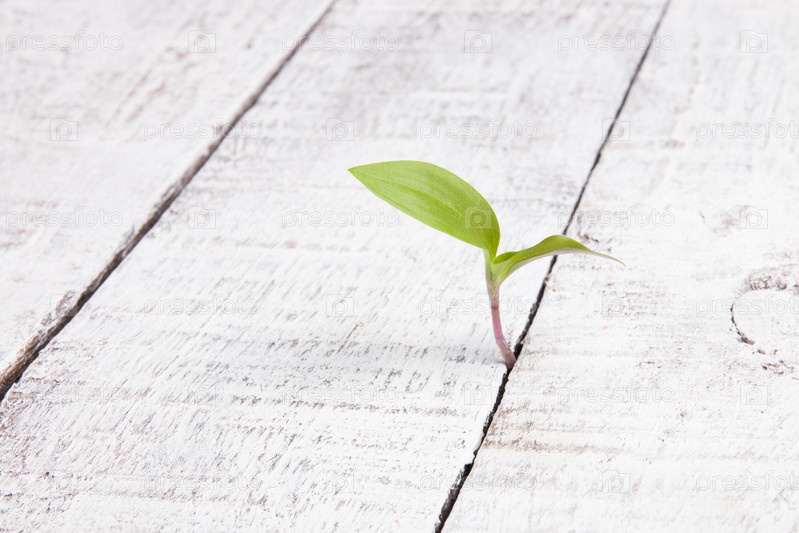 Зеленый росток растет сквозь деревянные доски, концепция новой жизни, преодоление препятствий и достижение желаемого, белый фон, состаренные доски, пространство для копирования, крупный план