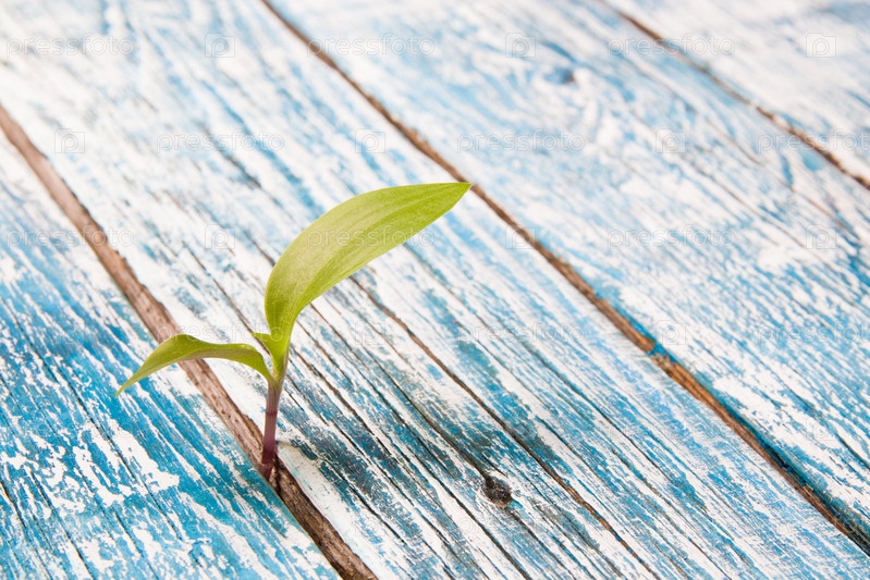 Зеленый росток растет сквозь деревянные доски, концепция новой жизни, преодоление препятствий и достижение желаемого, синий фон, состаренные доски, пространство для копирования, крупный план