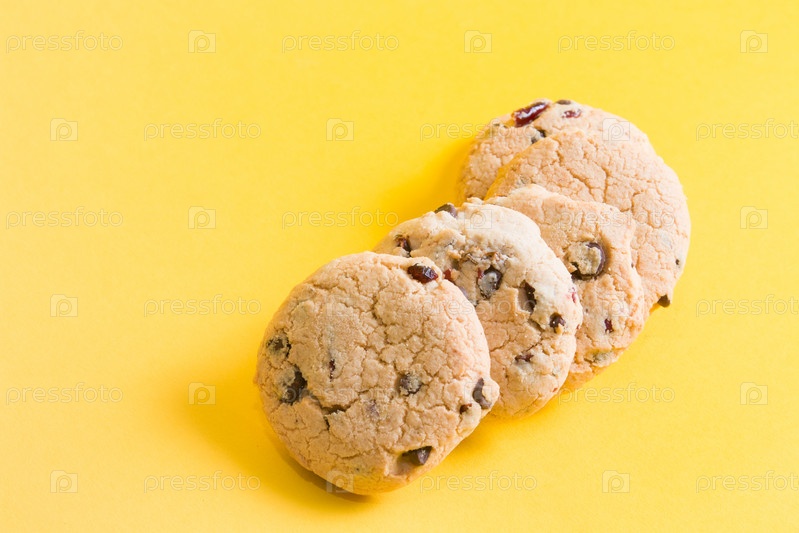 Печенье на желтом фоне, печенье с кусочками шоколада и брусникой