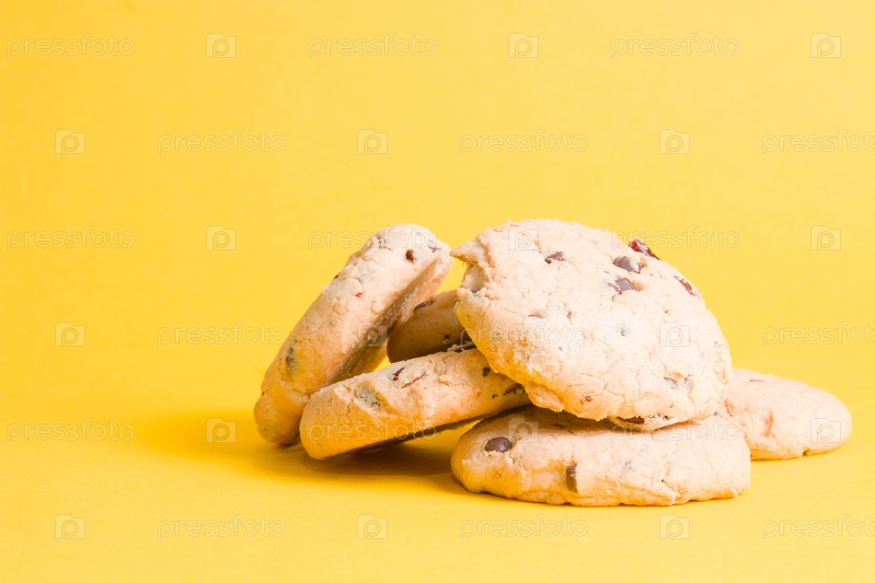 Печенье на желтом фоне, печенье с кусочками шоколада и брусникой