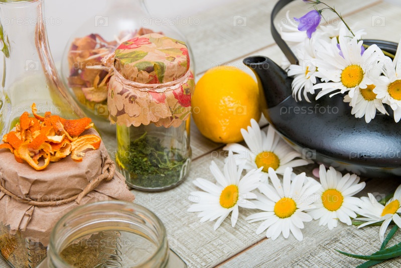 Различные таблетки, черный чайник с ромашками и разные банки чая на сером деревянном столе, сезонные, натуральные лекарства, лечение простуды
