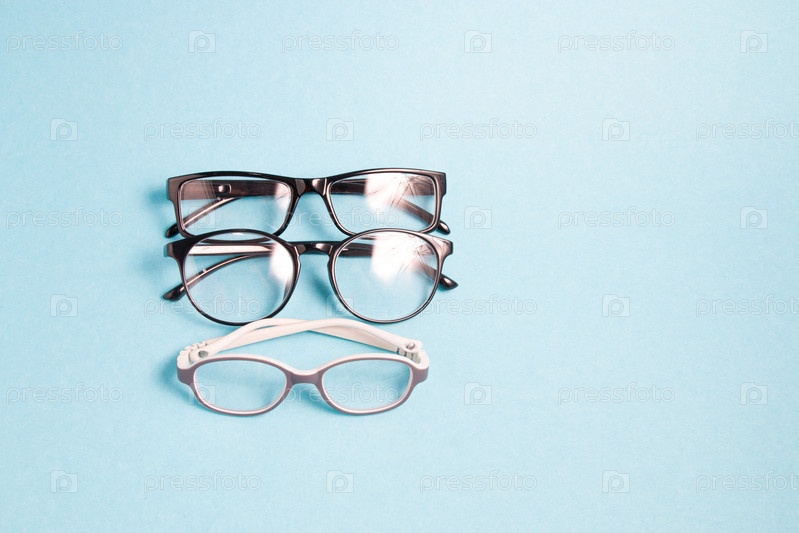 Несколько пар разных очков для коррекции зрения на голубом фоне; копия пространства, детские очки и речки для взрослых