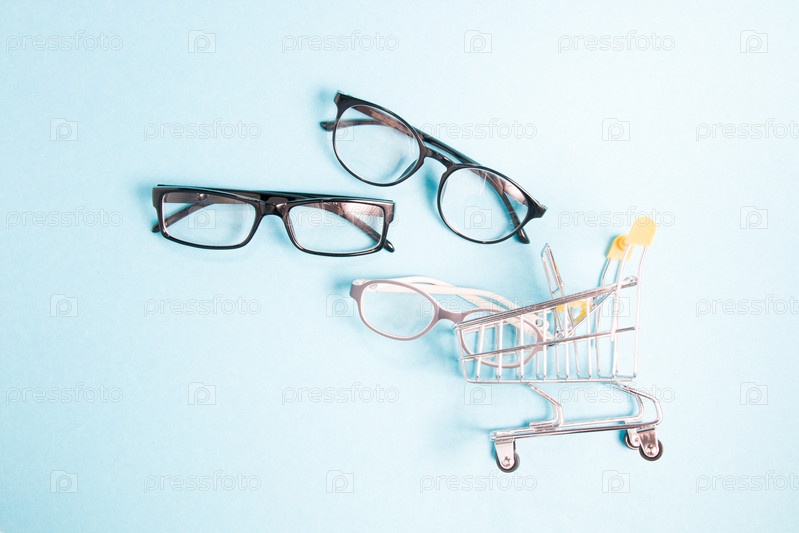 Очки для зрения и небольшая тележка для покупок, синий фон, пространство для копирования, онлайн-покупка очков и оправ для очков, интернет-магазин оптики, детские очки