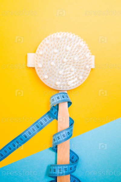 Деревянная щетка для сухого массажа тела на синем и желтом фоне, измерительная лента, обернутая вокруг ручки щетки, пространство для копирования, пилинг и уход за телом в домашних условиях