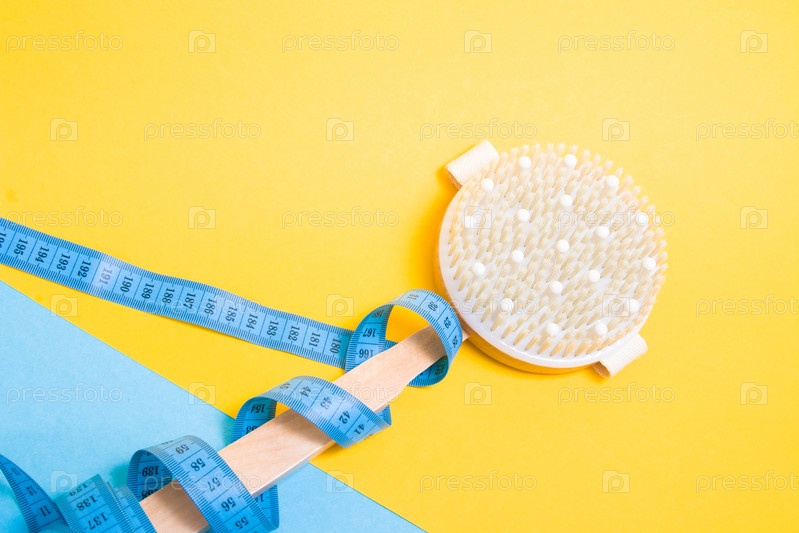 Деревянная щетка для сухого массажа тела на синем и желтом фоне, измерительная лента, обернутая вокруг ручки щетки, пространство для копирования, массаж для концепции похудения