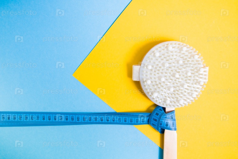 Деревянная щетка для сухого массажа тела на синем и желтом фоне, измерительная лента, обернутая вокруг ручки щетки, пространство для копирования, массаж для концепции похудения