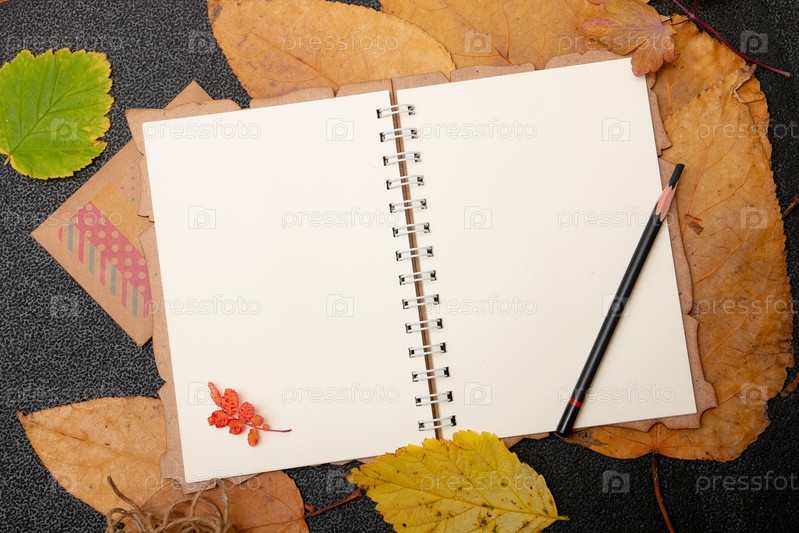 Белый пустой блокнот для рисования и письма на желтых осенних листьях черный фон место для копирования вид сверху
