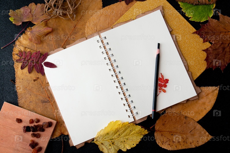 Карандаш на чистом блокноте жарить осенние листья на черном фоне копией пространства вид сверху