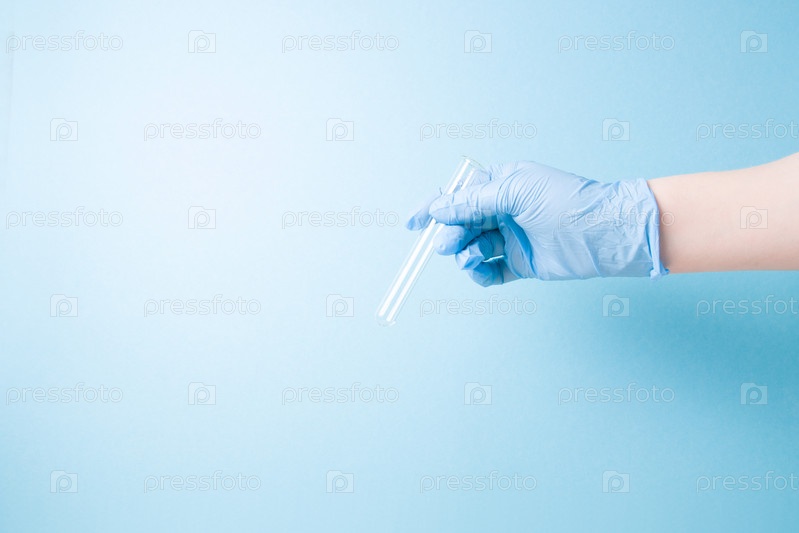 Рука в синей одноразовой медицинской перчатке держит стеклянную пустую пробирку, пространство для копирования на синем фоне