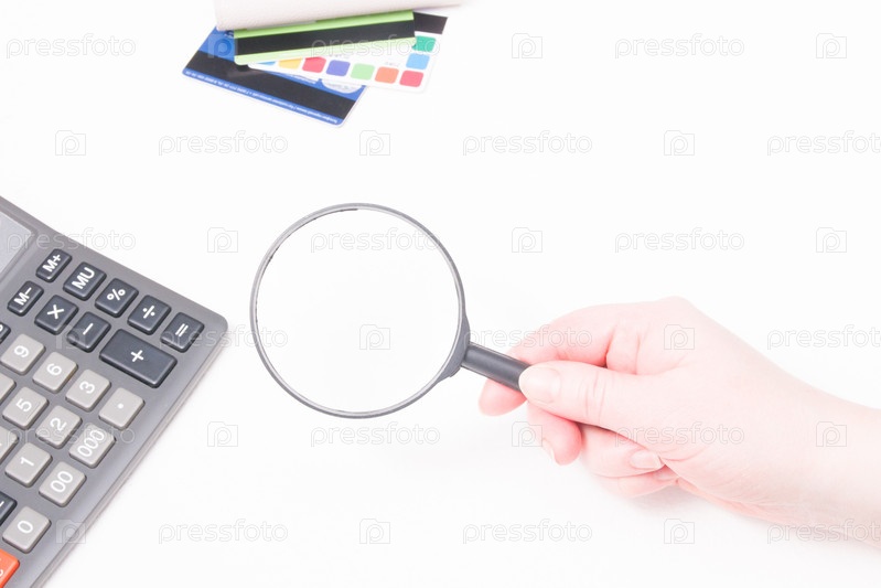 Рука держит лупу на белом фоне, банковские карты, калькулятор и кошелек на заднем плане, пространство для копирования, вид сверху
