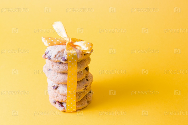 Печенье с кусочками шоколада и брусникой, перевязанное желтой лентой с бантиком на желтом фоне