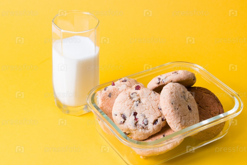Стакан молока и домашнее печенье с кусочками шоколада и брусникой в стеклянном контейнере для пищевых продуктов на желтом фоне копией пространства, концепция здоровых закусок