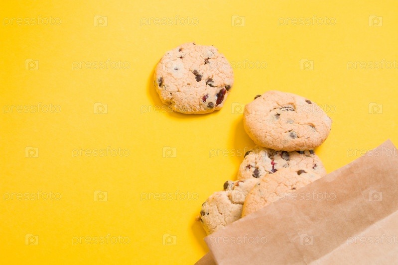 Домашнее печенье с кусочками шоколада и брусникой в бумажном пакете на желтом фоне копией пространства здоровая закуска на ходу концепция