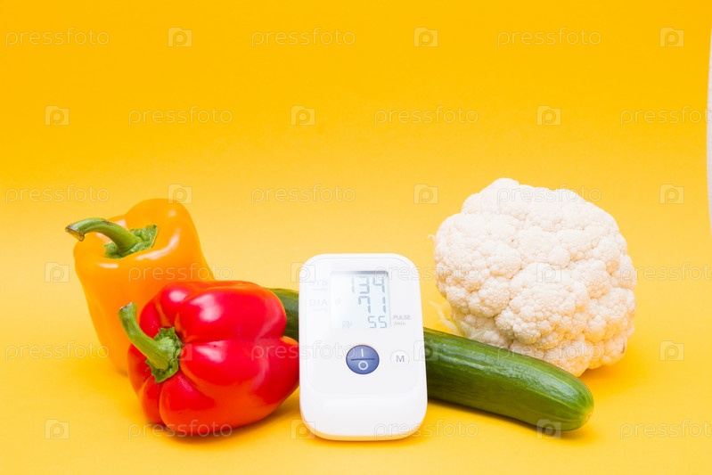 Монитор артериального давления и овощи на желтом фоне, пространство для копирования, правильное питание и концепция здравоохранения