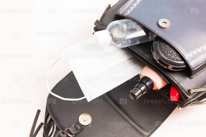 Смартфон, дезинфицирующее средство на основе гелевого спирта, синяя маска для лица, компактная расческа и косметика в сумочке на белом фоне, пространство для копирования, концепция пандемии коронавируса