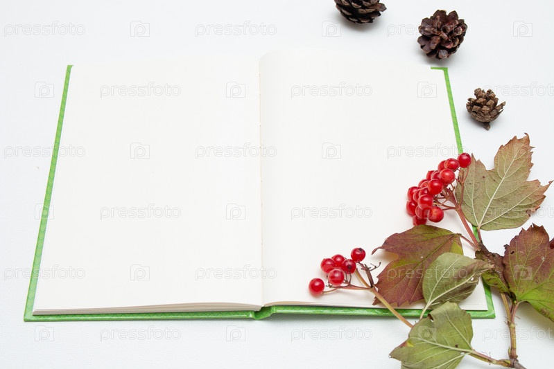 Ветка с красными ягодами калины и сосновыми шишками на открытой тетради с толстыми листьями на белом фоне копией пространства вид сверху место для текста начало осени