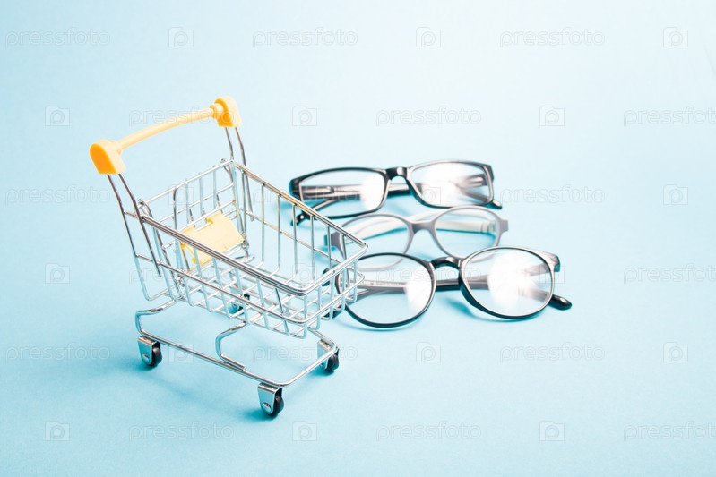 Маленькая тележка для покупок в фокусе, детские очки и две пары черных очков для взрослых в размытии, синий фон, пространство для копирования, онлайн-покупка очков и оправ для очков