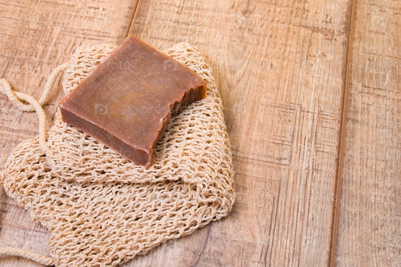Какао-мыло из натуральных ингредиентов на вязаной мочалке, домашнее мыло на деревянном фоне, ноль отходов образа жизни, какао-бар на мочалке из хлопчатобумажной нити