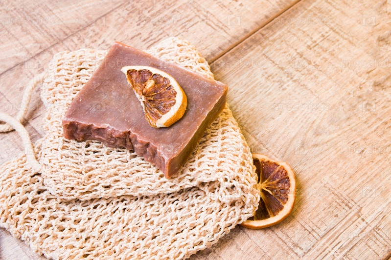 Какао-мыло из натуральных ингредиентов на вязаной мочалке, домашнее мыло и ломтики сушеного апельсина на деревянном фоне, концепция образа жизни без отходов