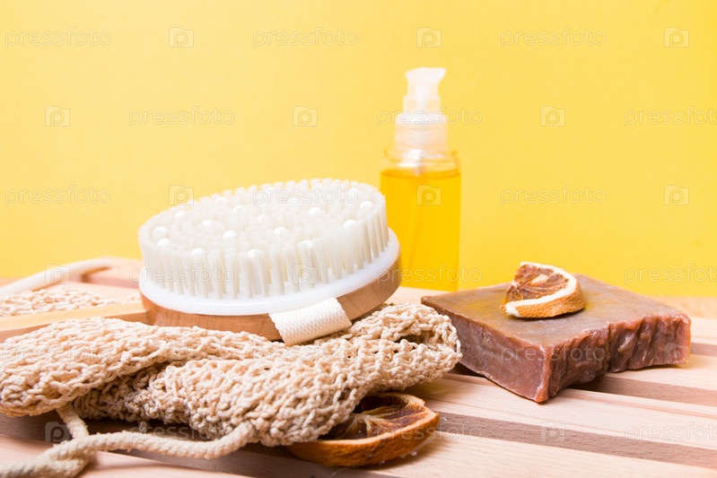 Сухая антицеллюлитная массажная щетка, вязаная мочалка, домашнее какао-мыло, сушеные дольки апельсина и масло для ухода за телом на деревянном подносе, вид сверху, пространство для копирования, плоская планировка