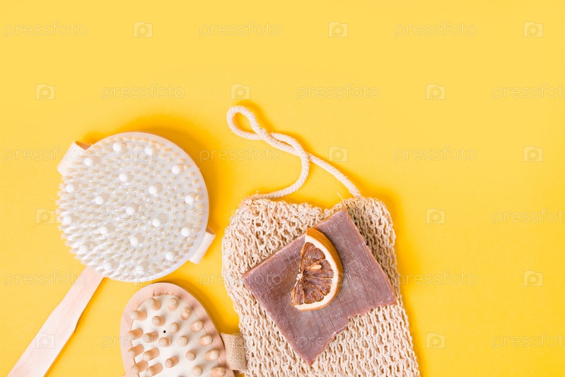 Сухая антицеллюлитная массажная щетка, вязаная мочалка, домашнее какао-мыло, сушеные дольки апельсина и деревянный массажер для тела на желтом фоне, вид сверху, пространство для копирования, плоская планировка