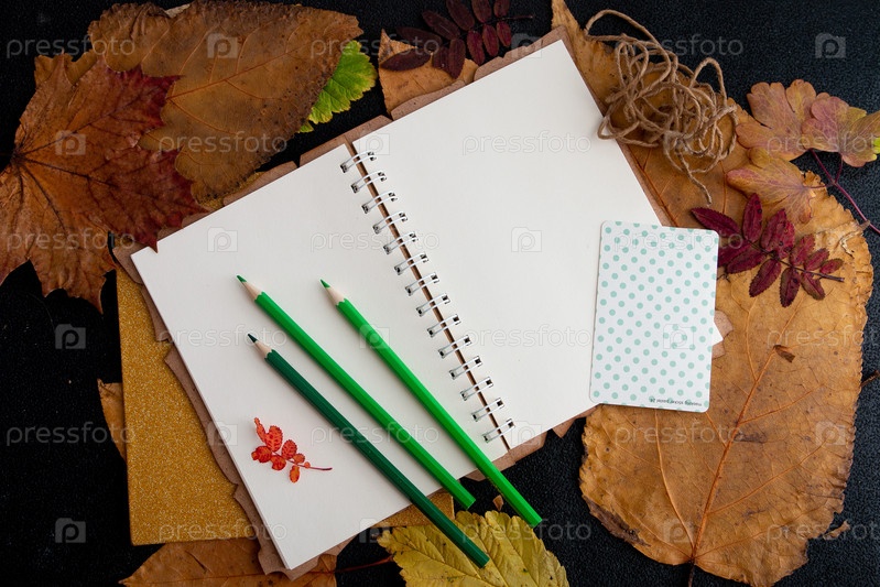 Сухие осенние листья и зеленые цветные карандаши на чистом листе блокнота, веревка, наклейка, изюм, праздничный подарок, запись в блокноте, черный фон, вид сверху, место, копия, сухие осенние листья