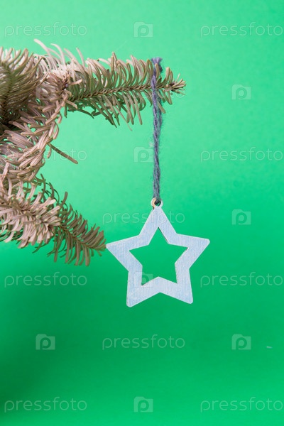Елочная игрушка в виде звезды висит на декоративной еловой ветке на зеленом фоне