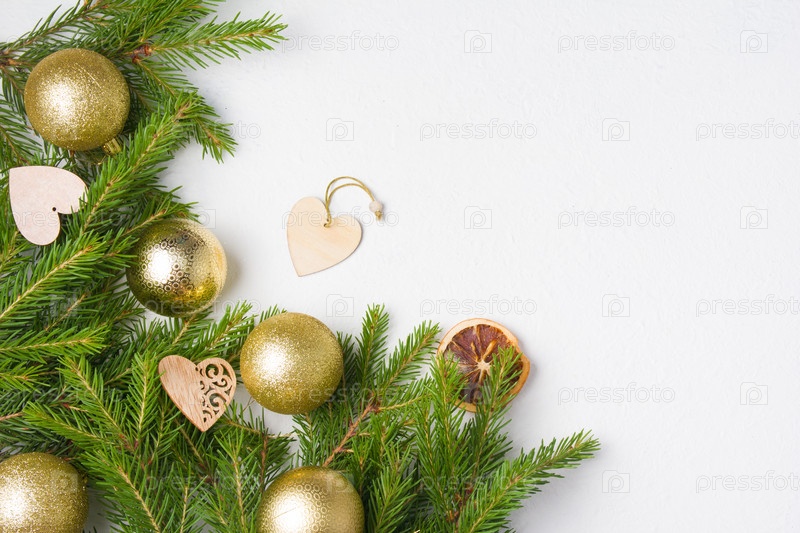Елочные золотые шары и натуральные еловые ветки на белом фоне вид сверху копия места, деревянные экологически чистые елочные игрушки на свежих еловых ветках