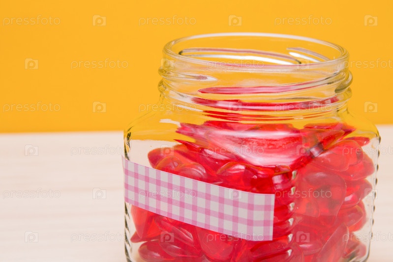 Банка с сердечками на столе, розовая наклейка на банке, желтый фон, концепция благотворительности и бескорыстной помощи, место для копирования