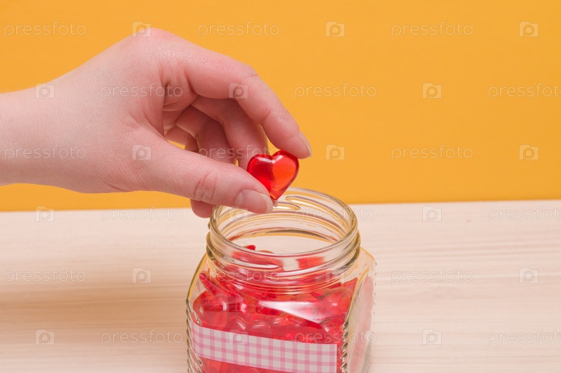 Женская рука кладет маленькое красное сердце в банку, банку с сердечками на стол, желтый фон, розовую наклейку на банку для вашего текста
