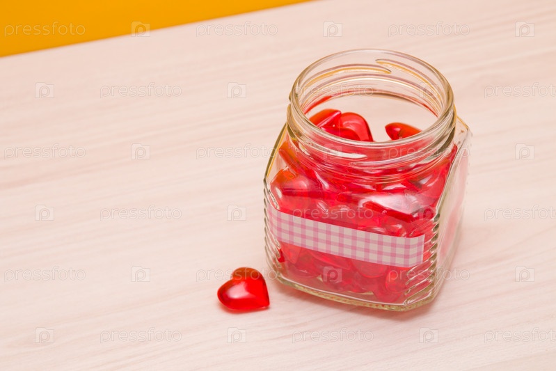 Банка с сердечками на столе, розовая наклейка на банке, желтый фон, концепция благотворительности и бескорыстной помощи, место для копирования