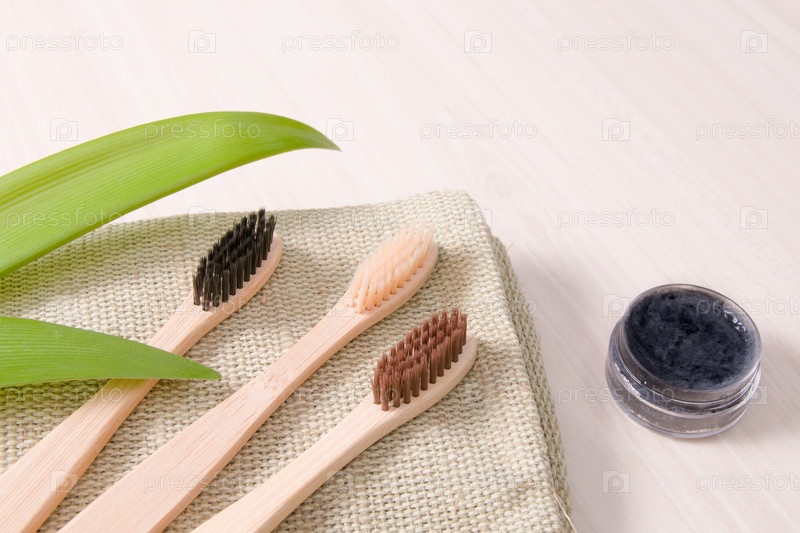 Бамбуковые зубные щетки на натуральной грубой ткани на деревянном столе, домашняя угольная зубная паста в маленькой стеклянной банке, листья длинных растений, экологически чистая концепция образа жизни