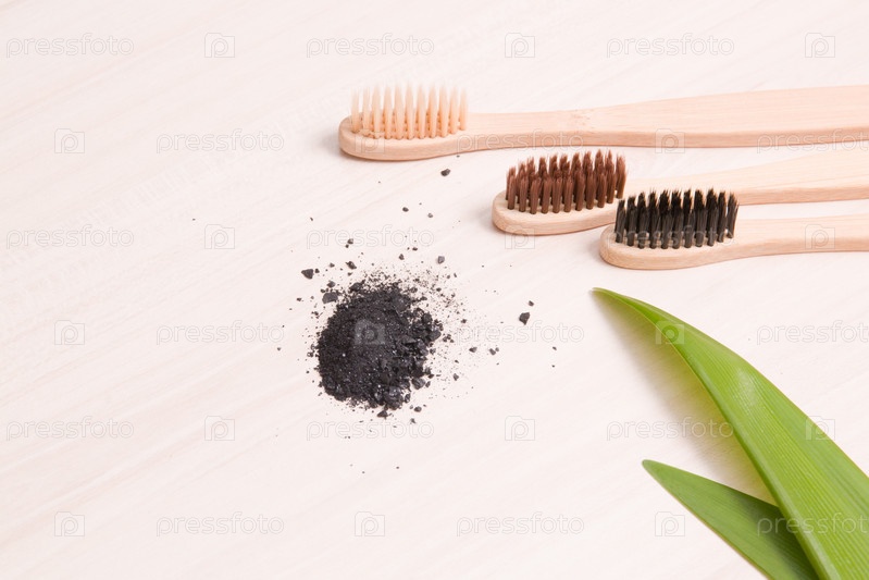 Бамбуковые зубные щетки на деревянном столе, куча древесного угля, листья длинных растений, экологически чистая концепция образа жизни