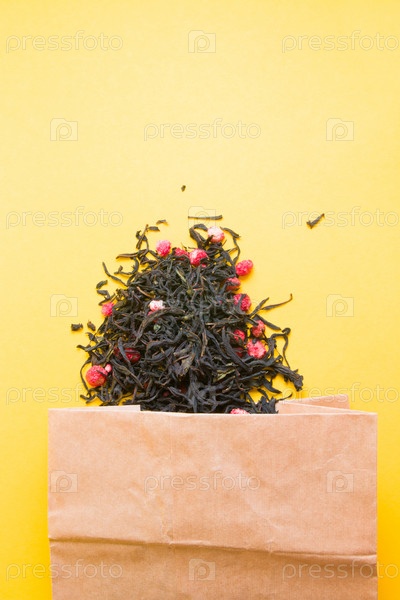 Домашний чай с сушеной клубникой в коричневом бумажном пакете на желтом фоне, чай выливается из пакета, пространство для копирования, вид сверху