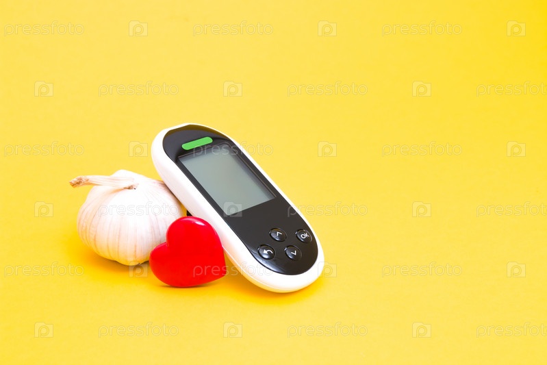 Глюкометр и чеснок на желтом фоне копией пространства, маленькое красное сердце с улыбкой, концепция здравоохранения, концепция дайбета, снижение уровня сахара в крови, контроль заболеваний