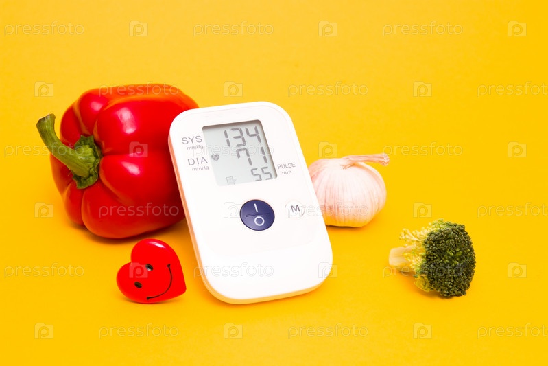 Тонометр на желтом фоне, овощи для правильного питания и диеты