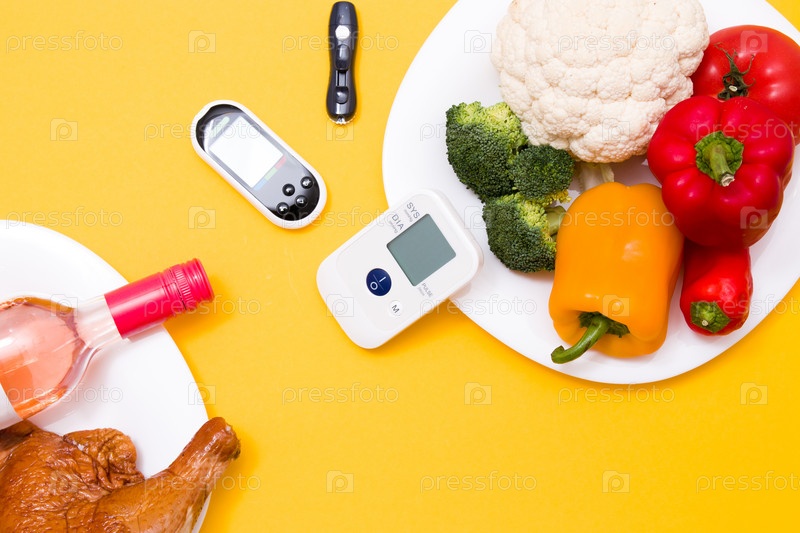 На одной белой тарелке бутылка вина и копченая курица, а на другой тарелке овощи, в середине глюкометр и измеритель артериального давления, желтый фон, пространство для копирования