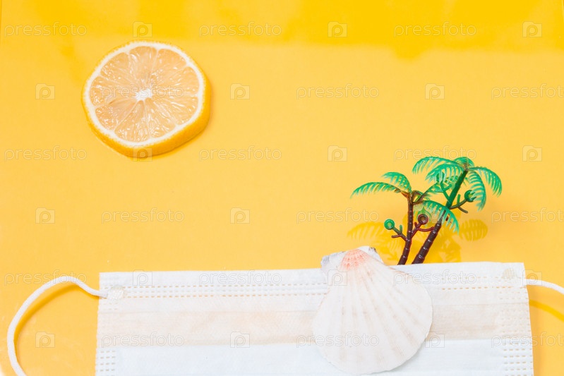 Игрушечная ладонь и ракушка на медицинской защитной одноразовой маске для лица, пространство для копирования на желтом фоне, ломтик лимона, как солнце, концепция «оставайся дома», отмена отпуска и пляжного отдыха