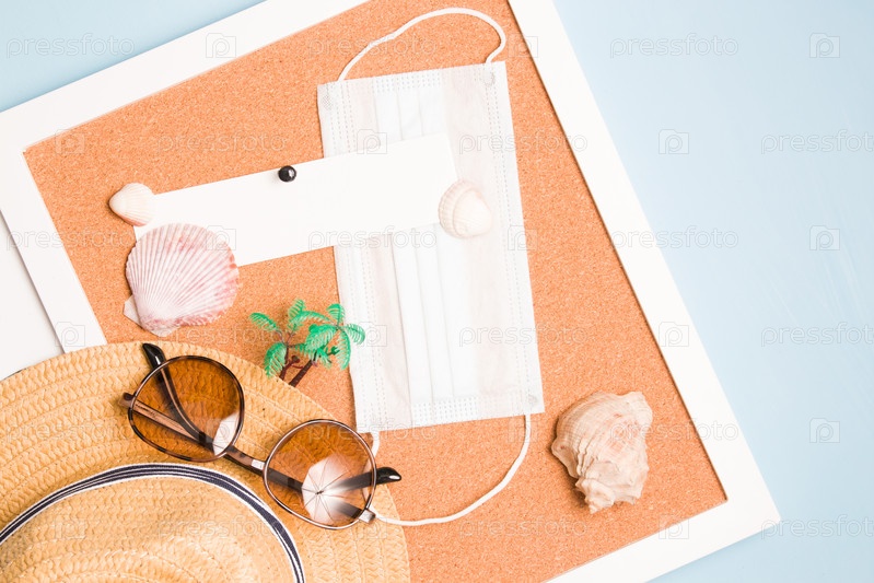 Соломенная шляпа, медицинская маска для лица, пальма, солнцезащитные очки и ракушки на пробковой доске, место для текста, синий фон, место для копирования, вид сверху, концепция путешествий и карантина