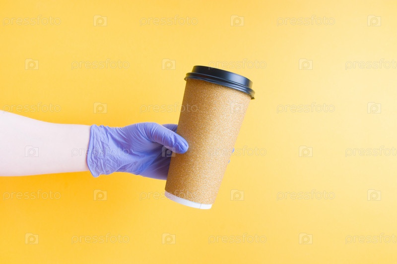 Рука в синей одноразовой резиновой перчатке держит блестящую золотую одноразовую картонную чашку кофе для фаст-фуда, концепция бесконтактной доставки, пространство для копирования на желтом фоне