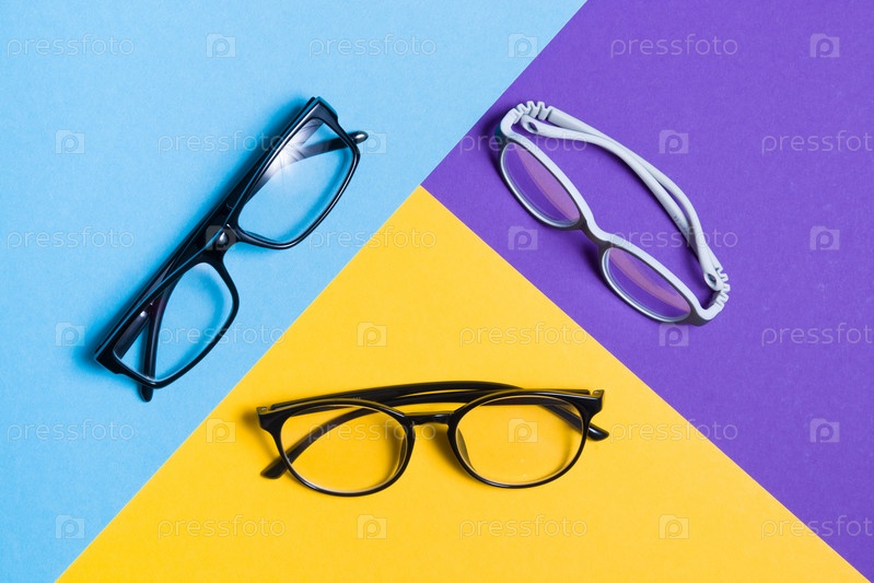 Несколько пар очков лежат на цветном фоне, очки для взрослых и детей, вид сверху, расположение копии, вид сверху