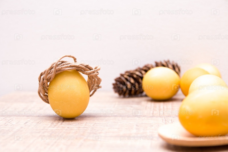 Золотые яйца на деревянном столе, яйцо в венке из бумажной нити, еловая шишка и светлый фон, пространство для копирования, пасхальный фон