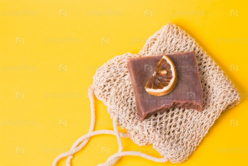 Домашнее мыло какао на вязаной тряпке с ломтиком сушеного апельсина на желтом фоне копией пространства вид сверху