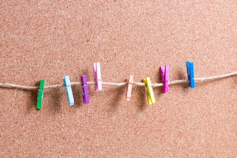 Сколько маленьких разноцветных деревянных бумажных прищепок на бумажной веревке на фоне пробковой доски для заметок, места для копирования, макета