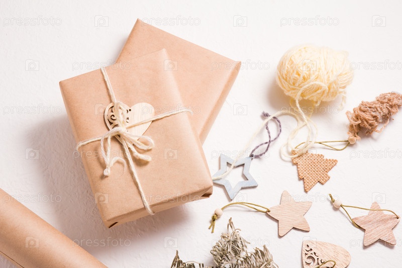 Экологически чистая упаковка подарочной коробки на рождество или новый год, деревянные елочные игрушки, коробка, завернутая в крафт-бумагу с еловой веткой и деревянным сердцем на белом фоне