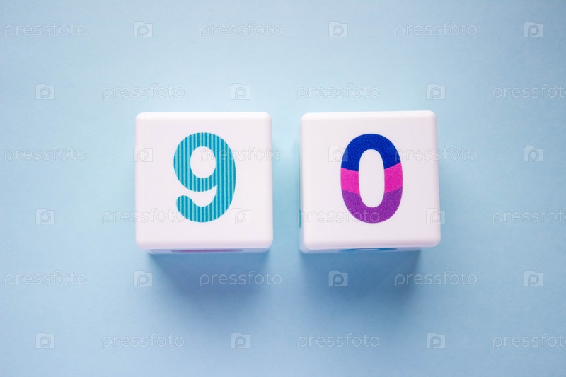 Крупный план белых пластиковых кубиков с красочным номером 90 на синем фоне. Объект в центре фотографии
