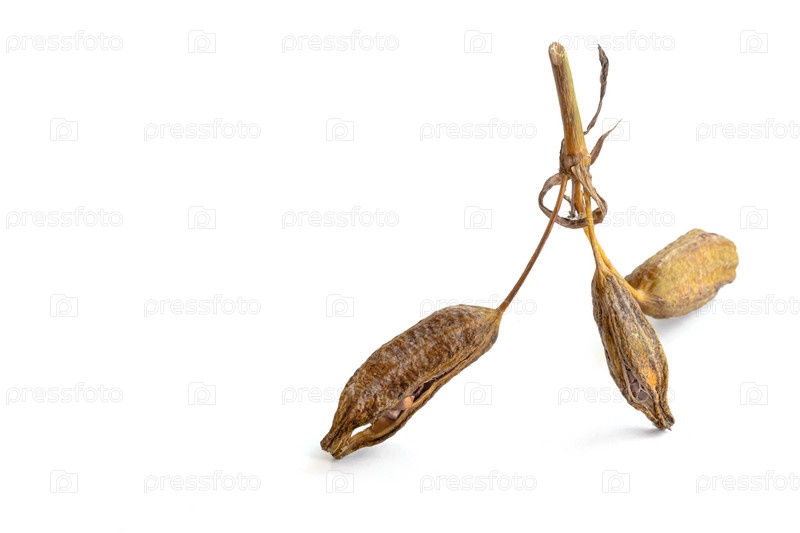 Семенные коробочки цветка ириса на белом фоне. Место для текста