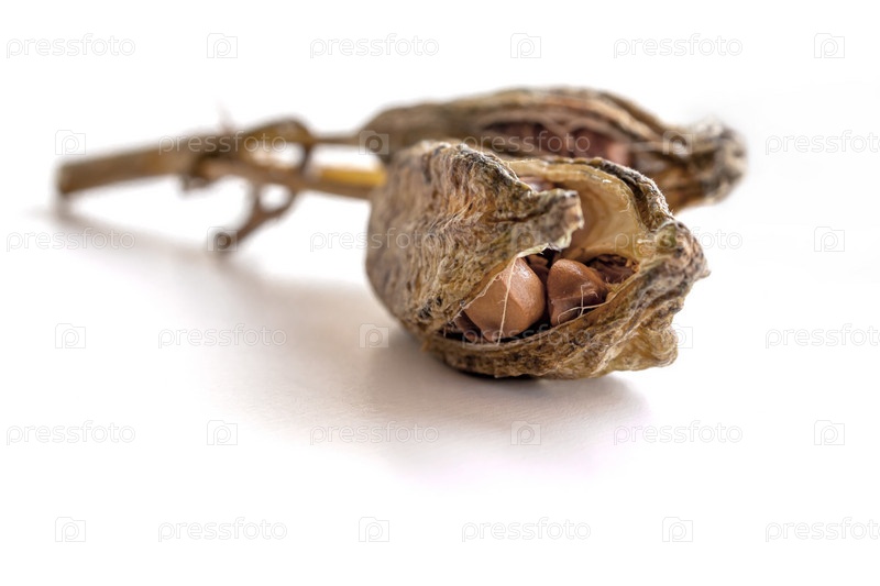 Высушенная семенная коробочка с раскрытием. Семена цветка ириса крупным планом на белом фоне