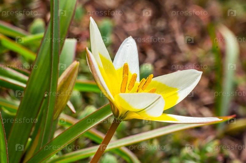 Желтый и белый тюльпан Тарда цветет в саду на естественном фоне